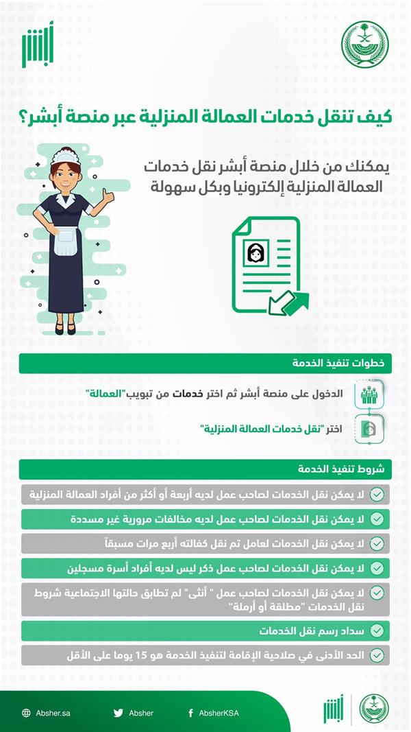 أوضحت منصة أبشر كيفية نقل خدمات العمالة المنزلية إلكترونياً عبر منصتها، وما هي الشروط اللازمة لتنفيذ تلك الخدمة.