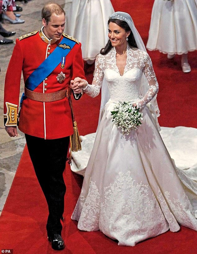 وبحسب صحيفة ديلي إكسبرس البريطانية، اقترضت كيت “تاج كارتييه هالو” من الملكة إليزابيث الثانية، ملكة بريطانيا جدة الأمير وليام؛ لارتدائه في يوم زفافها، وأنه تم شراء تلك القطعة الثمينة من قبل والدها الملك جورج السادس في عيد ميلادها الثامن عشر. وأصدر القصر الملكي بيانًا في يوم زفاف ويليام وكيت في 29 أبريل، عام 2011، قال فيه: “اختارت الآنسة ميدلتون العلامة التجارية البريطانية ألكسندر ماكوين، لجمال صنعه واحترام هذه العلامة للعمل التقليدي وصناعة الملابس الفنية.. وتمنت الآنسة ميدلتون أن يجمع فستانها بين التقليد والحداثة والرؤية الفنية التي تميز عمل ألكسندر ماكوين”. واحتفل الأمير وليام وكيت بعيد زواجهما العاشر في أبريل الماضي، إلى جانب أطفالهما الثلاثة، وهم: الأمير جورج، والأميرة شارلوت، والأمير لويس. وفي تلك المناسبة، ارتدى كلاهما ملابس بدرجات مختلفة من اللون الأزرق، فيما شوهدت كيت وهي ترتدي خاتم الخطوبة المصنوع من الياقوت.