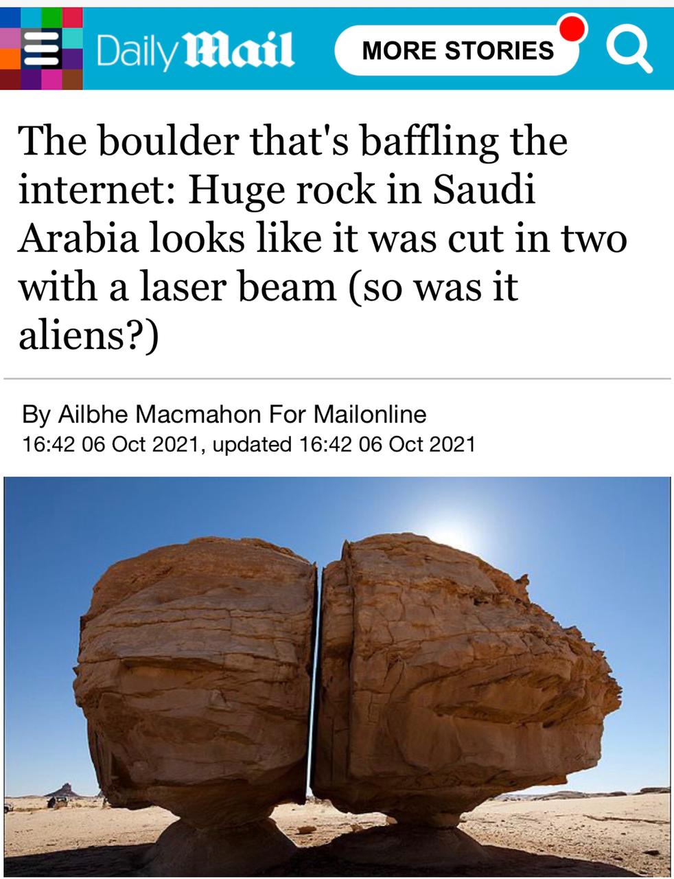 نشرت صحيفة “ديلي ميل” البريطانية؛ تقريرًا مفصلًا عن صخرة “النصلة” جنوب تيماء والتي حيّرت العالم بسبب انقسامها الغريب، ووضعت ثلاث نظريات أبرزها “الكائنات الفضائية”.
