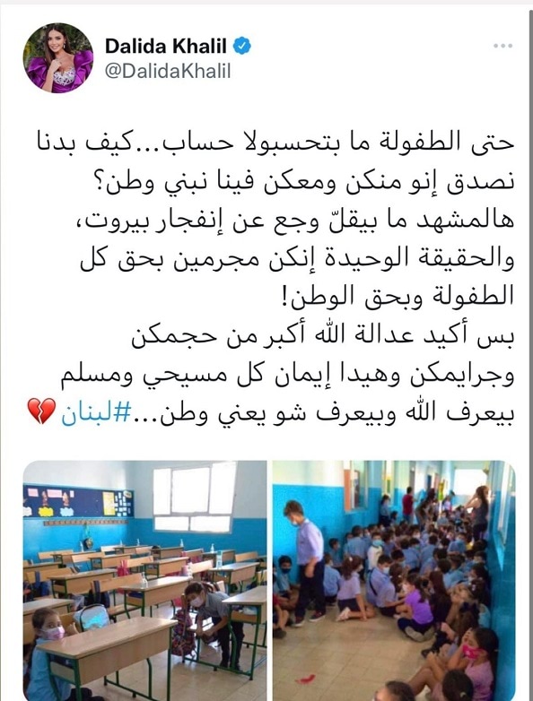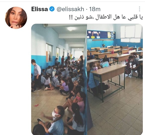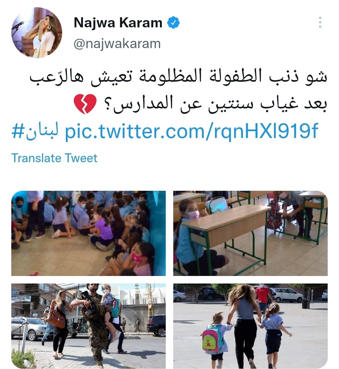 وعلقت الممثلة داليدا خليل على الصور بالقول: “حتى الطفولة ما بتحسبولا حساب…كيف بدنا نصدق إنو منكن ومعكن فينا نبني وطن؟”. وأضافت خليل أن هذا المشهد لا يقل وجعا عن انفجار بيروت، مؤكدة أن الحقيقة الوحيدة هي أن من يقوم بهذه الأعمال هو مجرم في حق الطفولة والوطن بأكمله. كما علقت: “هيدا إيمان كل مسيحي ومسلم بيعرف الله وبيعرف شو يعني وطن”. وعبرت إليسا عن حزنها لهذا المشهد المؤلم، متسائلة: “ما ذنب الطفولة لتمر بهذه الظروف الصعبة؟”. وتساءلت نجوى كرم عن الذنب الذي اقترفه هؤلاء الأطفال لعيشوا هذه اللحظات العصيبة، والشعور بهذا الرعب بعد غياب دام سنتين عن المدارس.