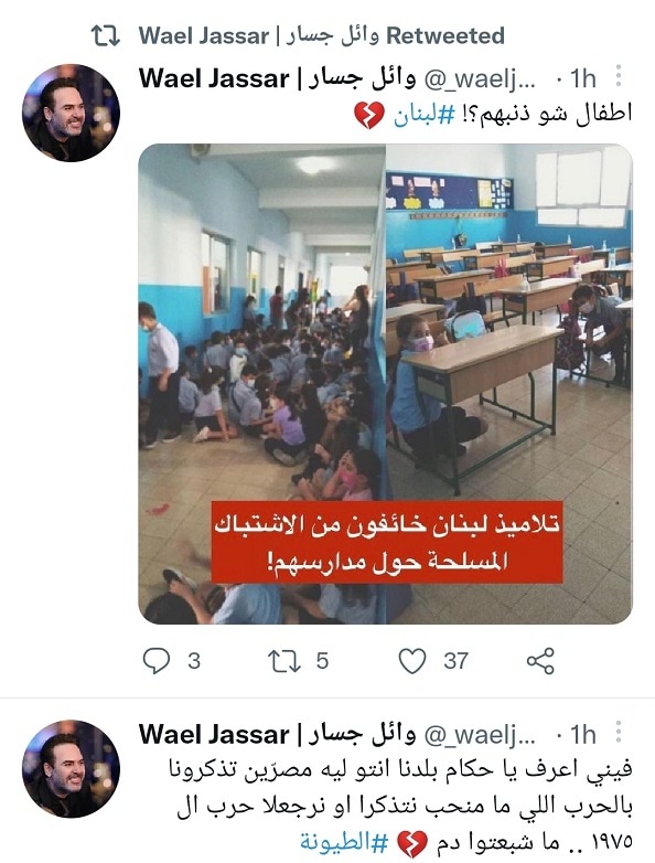 كما نشر وائل جسار صور الأطفال المتداولة في المدرسة، معلقًا بأن “حكام لبنان لم يشبعوا من سفك الدماء وكأنهم مصرون على استذكار الحرب الأهلية فيعيدونا بالذاكرة لسنة 1975”. وسخرت النجمة ماغي بوغصن من ردة فعل المسؤولين حول ما يجري في لبنان، معتبرة أن كمية الاستغراب من الاشتباكات المسلحة، تدل على طيبة قلوبهم على المسلحين، مستطردة بالقول: “نحنا وأولادنا منتناقش بالوضع ومنقرر اذا بيروحوا عالمدارس او لا. تفاجأتم ما هيك؟”. واعتبرت يارا أن الحديث قد انتهى أمام هذه المأساة، معلقة بالقول: “يعني عنجد خلص الحكي. قرفنا نحكي قرفنا كلّ شيء. ما بعرف ايمتا بدنا نخلص بقى ونرتاح. الله يسامحكم بس لا ما نقول شي غير. إلنا الله”. كما علقت مايا دياب: “المشهد اليوم ببيروت مش بس بزعل بيحرق القلب.. مناظر التلاميذ المرعوبين رجعنا سنين لورا على مشاهد الحرب اللي تركت جرح بقلب كل شخص فينا.. مصرين زعماء الحرب يفرقوا الجار عن جاره والخي عن خيو”.