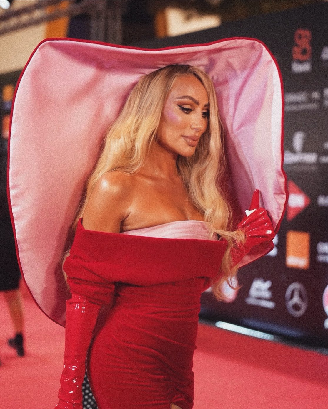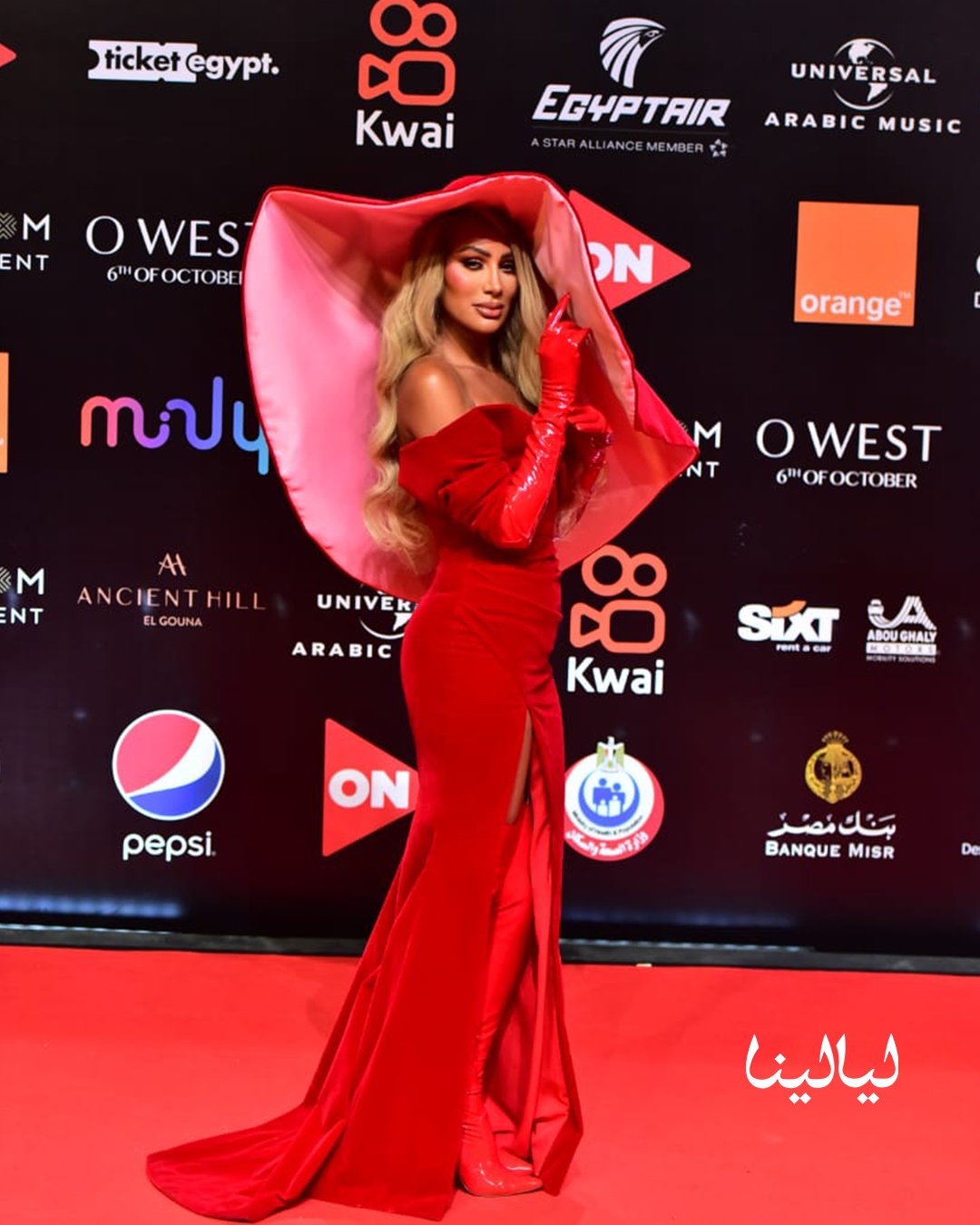 وظهرت الفنانة اللبنانية بفستان أحمر، ونسقت قفازات جلدية من نفس اللون، وارتدت على رأسها قبعة حمراء ضخمة.
