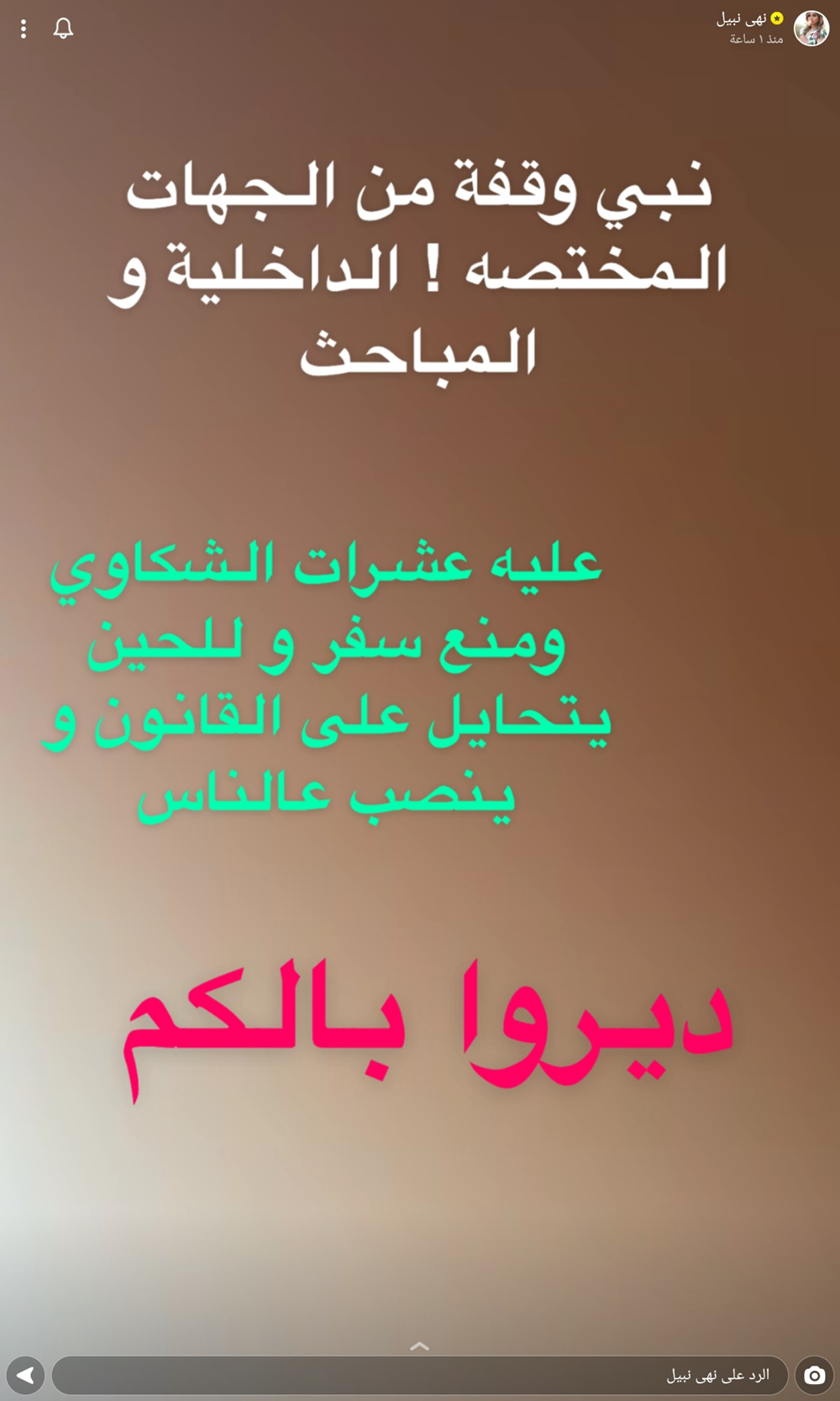 ونشرت نبيل عدة منشورات، عبر حسابها على موقع “سناب شات”، كشفت خلالها تفاصيل الموضوع، حيث دونت منشوراً قالت فيه: “تحذير لكل زملائي المشاهير وأصحاب الحسابات والمشروعات، في نصاب يحمل جنسية عربية يعيش في الكويت تعمد النصب على الكثير من أصحاب المشروعات والحسابات والمشاهير، يوهمكم أنه شريك بشركة فيسبوك ويزعم توثيق حساباتكم عبر منصات التواصل الاجتماعي ولما تدفعون له يهرب ولا يوثق”.