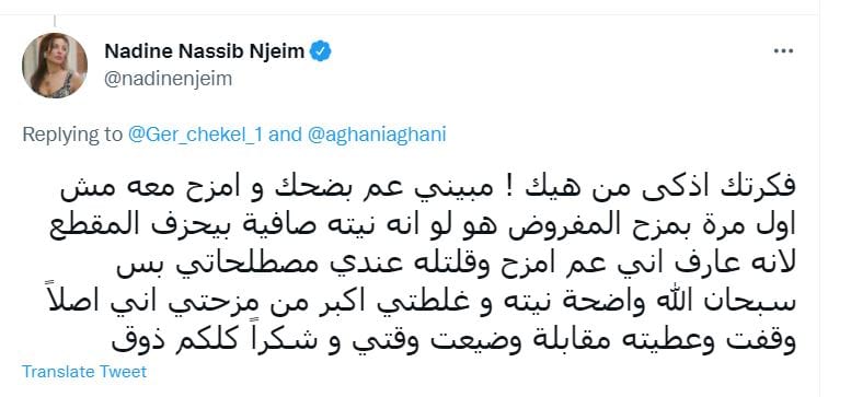 كما ردت نادين نجيم، على إحدى الصفحات الشهيرة التي انتقدت استخدامها في الكلمة قائلة: “فكرتك أذكى من هيك! مبيني عم بضحك وامزح معه مش أول مرة بمزح المفروض هو لو انه نيته صافية بيحزف المقطع لانه عارف إني عم أمزح وقلتله عندي مصطلحاتي بس سبحان الله واضحة نيته وغلطتي أكبر من مزحتي إني أصلاً وقفت وعطيته مقابلة وضيعت وقتي وشكراً كلكم ذوق”.