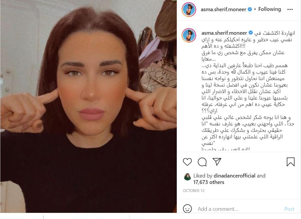 تابعت أسما منير: “وهنا أنا بوجه شكر لشخص غالي علي قلبي جدًا، اللي واجهني بعيبي، هو عارف نفسه أنا حقيقي بحترمك وبشكرك على طريقتك الراقية اللي علمتني بيها النهاردة أكتر عن نفسي”. ولفتت: “عيبي إني (مبسمعش).. أنا عامل زي المترليوس وأنا زعلانة، والفكرة إني كنت فاكرة نفسي مستمعة جيدة جدًا كمان، بس الحقيقة إني فعلاً وأنا زعلانة مش بسمع غير نفسي وصوت دماغي ووجهة نظري واللي مزعلني (بس) ومش بيكون هاممني غير إني أدلق اللي جوايا عشان أرتاح بدون أي تفكير في الطرف الآخر، وده حقيقي شيء مزعج وفي منتهى الأنانية، والحقيقة إن الطريقة اللي فوقتني هي النقد الإيجابي البناء اللي هدفه الأساسي الإصلاح”.