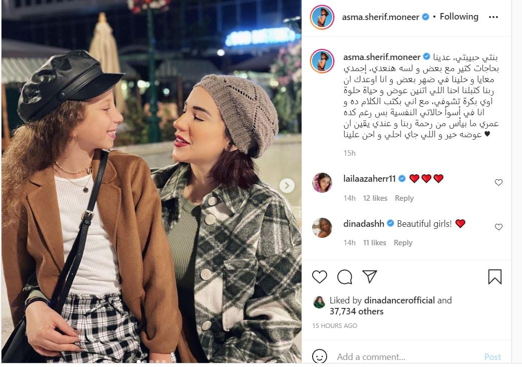 تعيش الإعلامية المصرية أسما شريف منير بأسوأ حالاتها النفسية وفق قولها، وطلبت المساندة من ابنتها الوحيدة. ونشرت أسما مجموعة من الصور عبر صفحتها على إنستغرام برفقة ابنتها، وقالت: “بنتى حبيبتي، عدينا بحاجات كتير مع بعض ولسه هنعدي، اجمدي معايا وخلينا في ضهر بعض وأنا أوعدك أن ربنا كتبلنا إحنا اللي تنين عوض وحياة حلوة اوي بكرة تشوفي”. وأضافت أسما: “مع إني بكتب الكلام ده وأنا في أسوأ حالاتي النفسية بس رغم كده عمري ما بيأس من رحمة ربنا وعندي يقين أن عوضه خير واللي جاي أحلى وأحن علينا”.