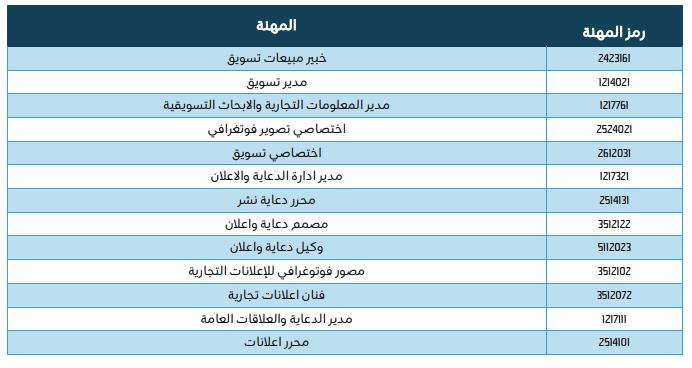 وتضمن قرار توطين مهن التسويق المسميات الوظيفية الآتية: خبير مبيعات تسويق، ومدير تسويق، ومدير المعلومات التجارية والأبحاث التسويقية، واختصاصي تصوير فوتوغرافي، واختصاصي تسويق، ومدير إدارة الدعاية والإعلان، ومحرر دعاية نشر، ومصمم دعاية وإعلان، ووكيل دعاية وإعلان، ومصور فوتوغرافي للإعلانات التجارية، وفنان إعلانات تجارية، ومدير الدعاية والعلاقات العامة، ومحرر إعلانات. أما قرار توطين المهن الإدارية المساندة فاشتمل على مهن: مترجم، ومترجم فوري، وأخصائي لغات، وأمين مخزن، وسكرتير، وسكرتير وكاتب اختزال، وسكرتير تنفيذي، وكاتب إدخال بيانات. ومن المقرر أن يتم تنفيذ القرارين الوزاريين الملزمين بتوطين مهن التسويق والمهن الإدارية المساندة من يوم 7/ 10/ 1443هـ، الموافق 8/ 5/ 2022م.