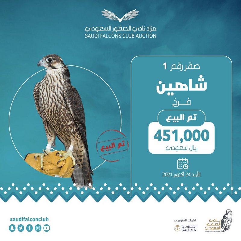 حقق الصقر رقم 1 في مزاد نادي الصقور السعودي في يومه الثامن عشر رقمًا قياسيًّا في مبيعات النادي منذ بدايته قبل أسابيع بعد أن تم بيعه مساء أمس الأحد في المزاد بمبلغ (451) ألف ريال محققًا بذلك أعلى صفقة هذا الموسم.