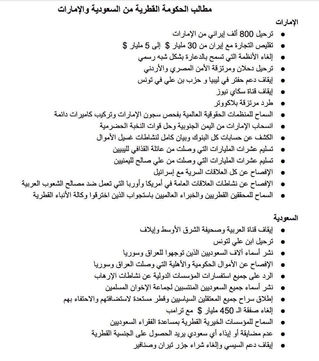 *خلاصة القائمه هم لايرغبون برجوع قطر اليهم ويريدون عزلها للأسف خاصة انه يوجد مطالبات ماليه تعويضيه لجميع الدول*